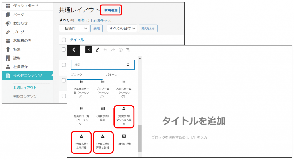 各ページでブロックを追加し、その他枠にある[(売買広告)マンション詳細][(売買広告)土地詳細][(売買広告)戸建て詳細]をそれぞれ選択してください。