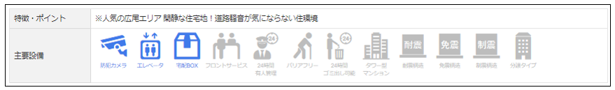 主要設備 :物件情報に登録されている設備が青く光ります。