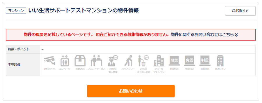 | 公開 | アクセス可能 | アクセス可能 ※募集中物件は1件もなしの旨を表示 ![]() |