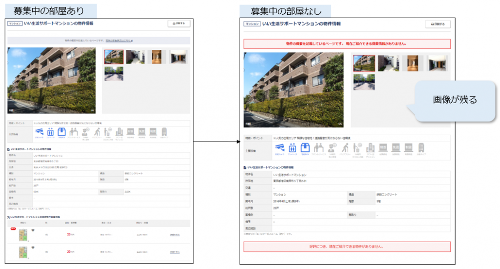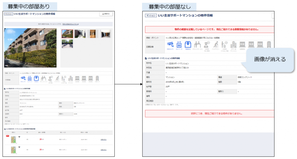 建物が満室になり募集中の部屋が1件も無くなった際、建物ページの画像は非表示になりますが、