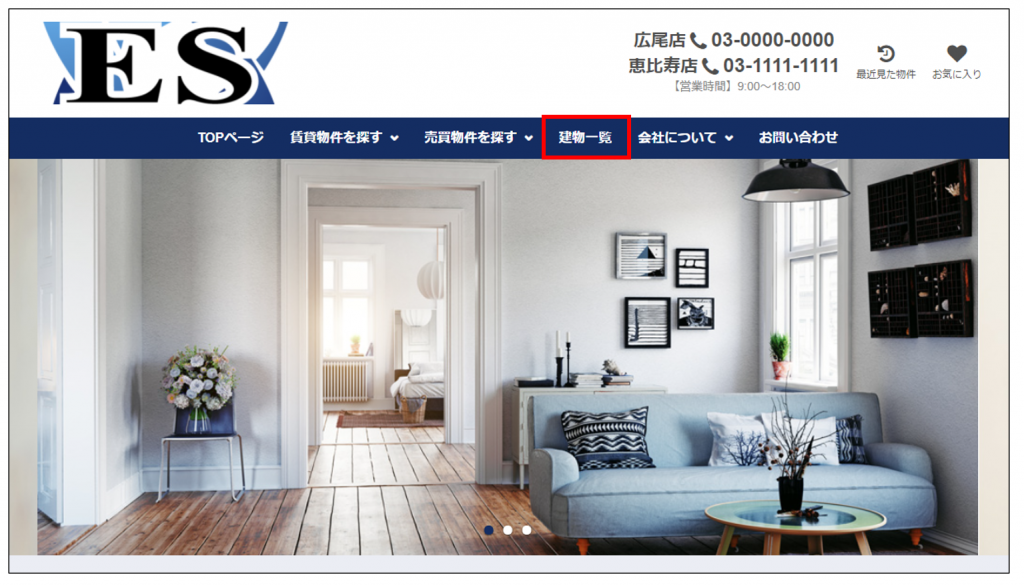 「建物一覧」は予め公開サイトのメニューやTOPページ等、任意の場所にリンクを設置する必要があります。