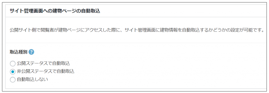 機能設定にて「サイト管理画面への建物ページの自動取込」の項目を設定します。