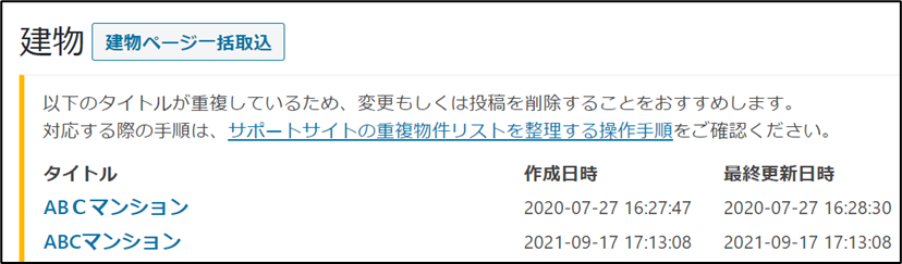 建物一覧上部に重複物件リストが表示された場合は重複物件を整理します。