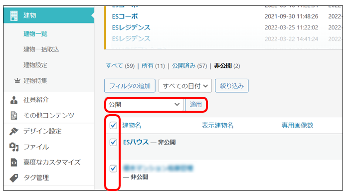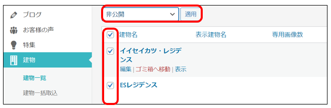 非公開ステータスに変更したい建物にチェックを入れ「一括操作」の「公開」を選択してください。