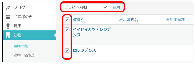削除したい建物にチェックを入れ「一括操作」の「ゴミ箱へ移動する」を選択してください。