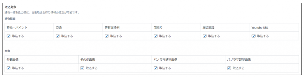 建物一括取込の際に、自動取込を行う項目を選択します。
