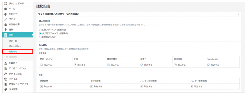 本ページでは[建物設定>サイト管理画面への建物ページの自動取込]の項目について説明しています。