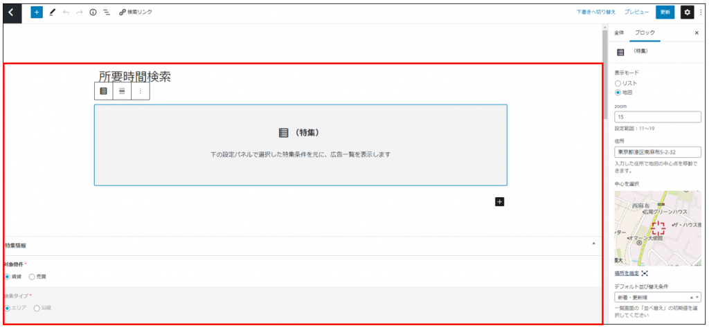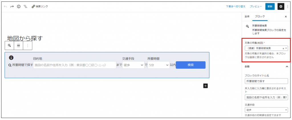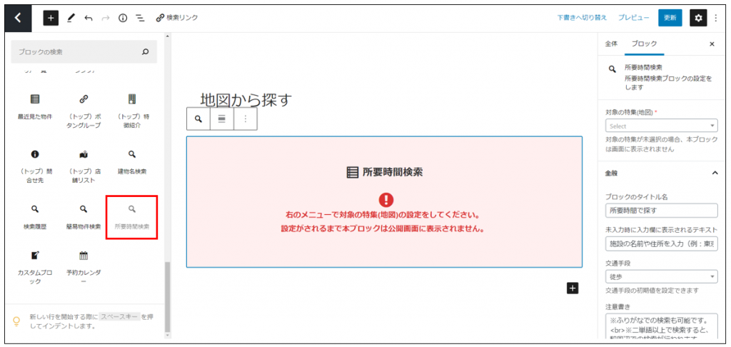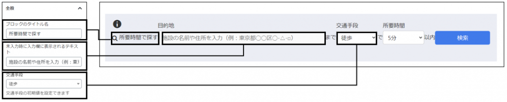 ②ページのタイトル等を入力して所要時間検索ブロックを追加します。