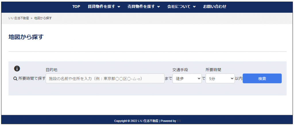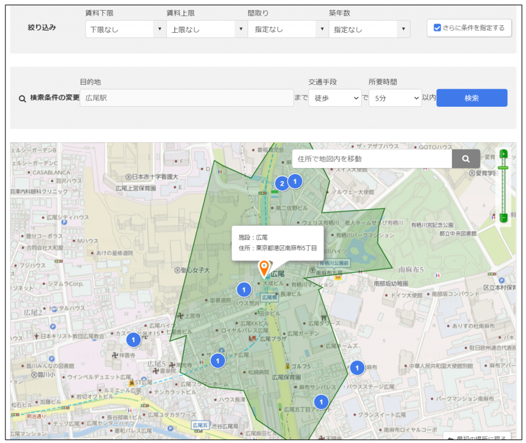 - 所要時間検索とは、特定の施設や住所までの移動に必要な時間を元に、物件を検索できる機能です。