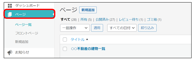 ①管理画面のページメニューよりページを追加、または任意のページの編集画面を開きます。