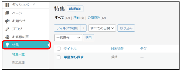 ①管理画面の特集メニューより、所要時間検索ブロックに設定するための特集を追加します。