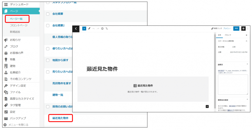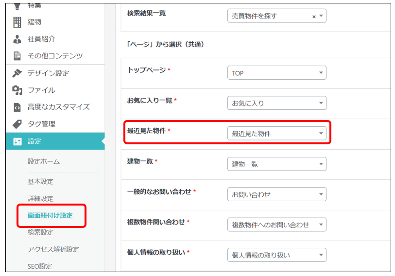 設定>画面紐付け設定>最近見た物件にて新規作成したページを割り当てることで公開サイト側に反映します。