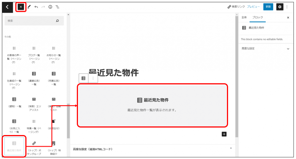 →「最近見た物件」はブロック一覧の「その他>最近見た物件」から挿入できます。
