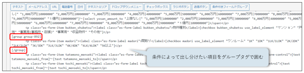 土地以外の種別と等しい場合にグループタグ(group-892)で囲んだ項目が表示されるよう設定します。