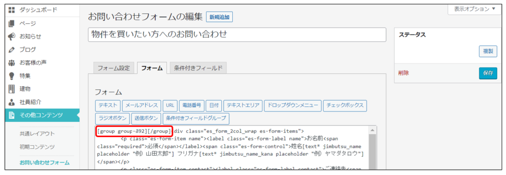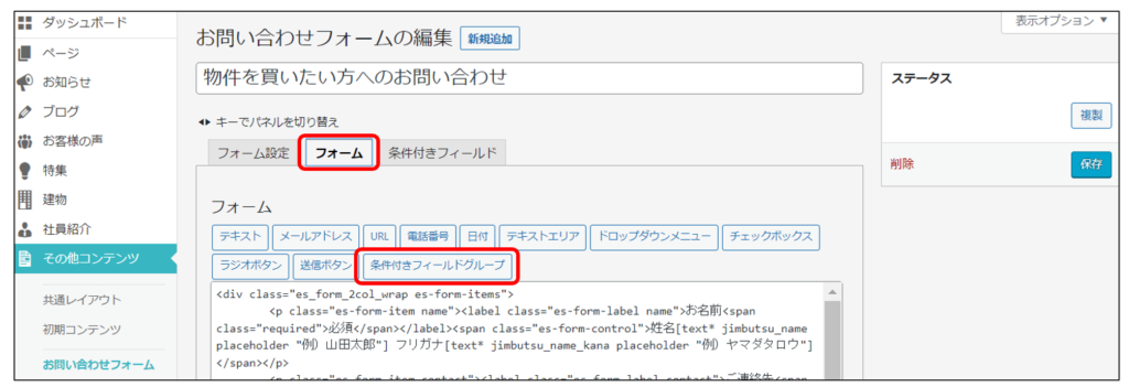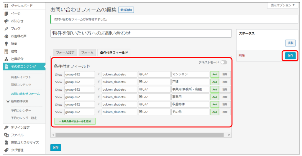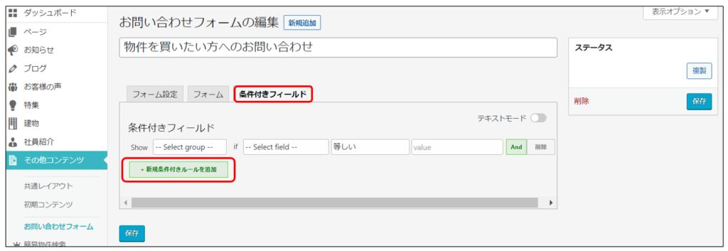 ※条件付きフィールドは、標準のお問い合わせフォームを複製したものでのみ設定可能です。