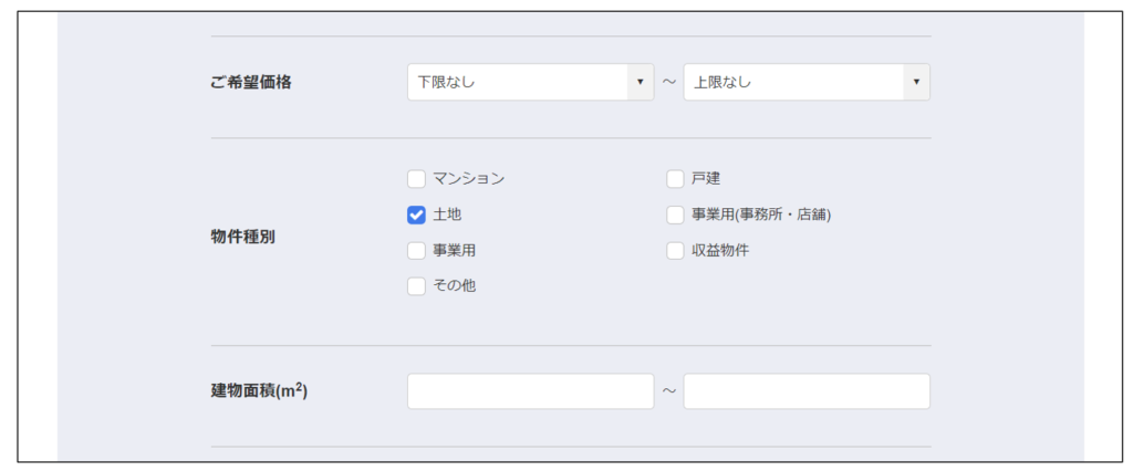 ・物件を買いたいお客様向けのお問い合わせフォームで、選択した物件種別によって入力項目を切り替える