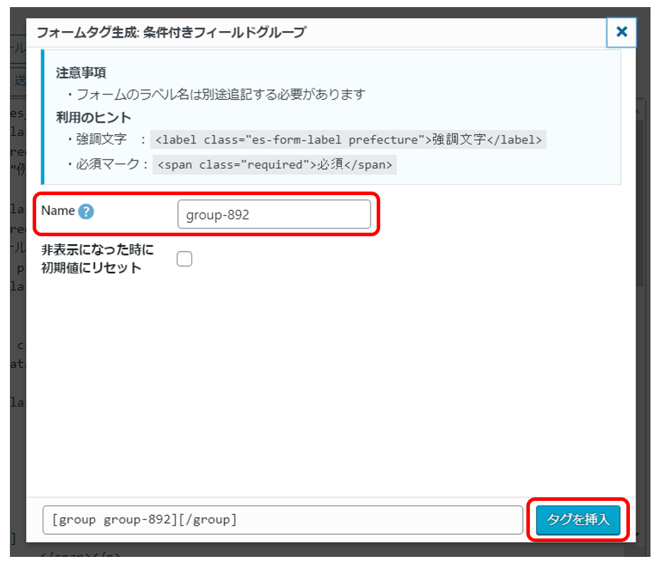 ②グループ名を入力してタグを挿入します。