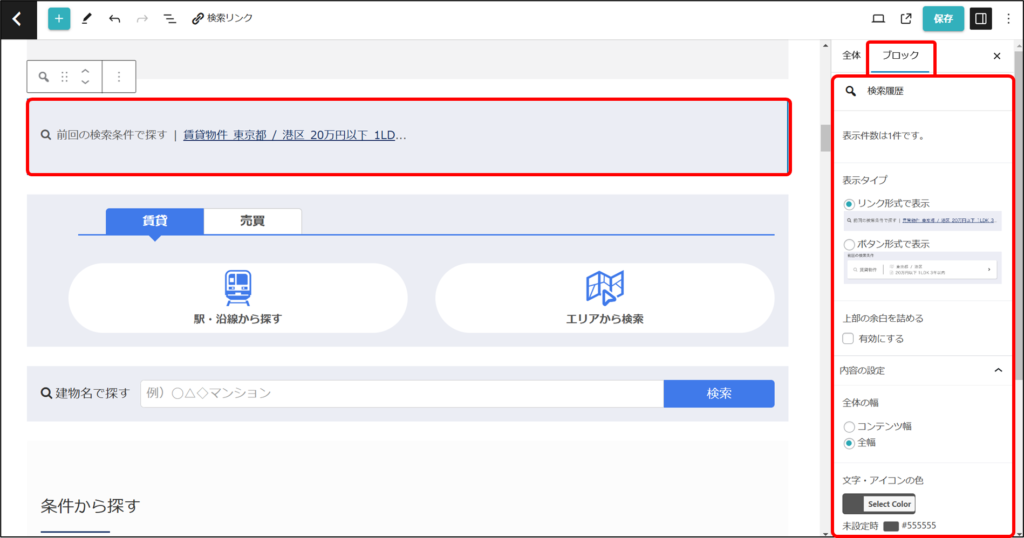 - ブロックには直前の検索履歴が1件表示されます。表示される条件は下記の通りです。