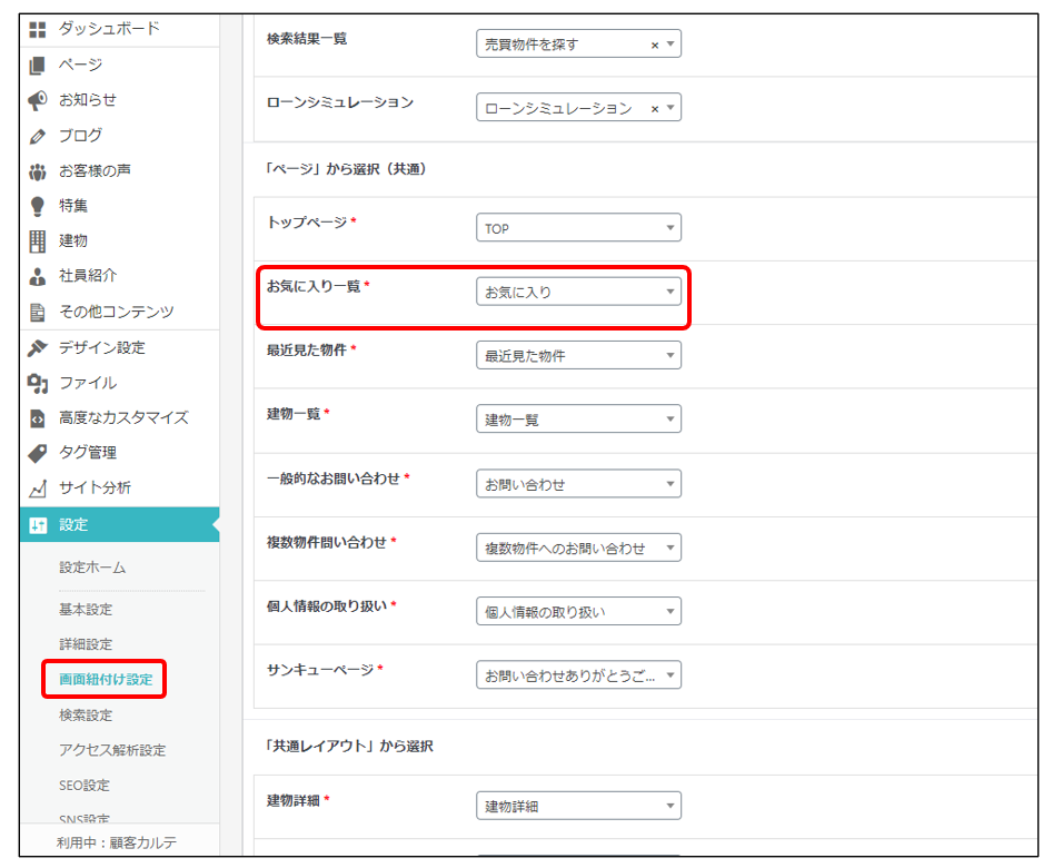 また、[設定>画面紐付け設定>お気に入り一覧]にて新規作成したページを割り当てることで