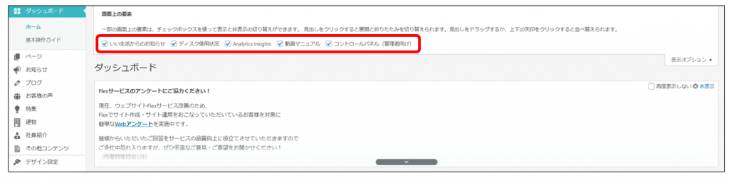 ダッシュボードでは、以下の項目の表示/非表示を切り替えることができます。