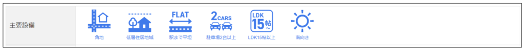 | 角部屋 | 概要タブ>住戸・区画設備>位置・フロア>特徴・設備>「四方角部屋」「角住戸」「東南角住戸」「3方角住戸」「南西角住戸」のいずれかを選択 |