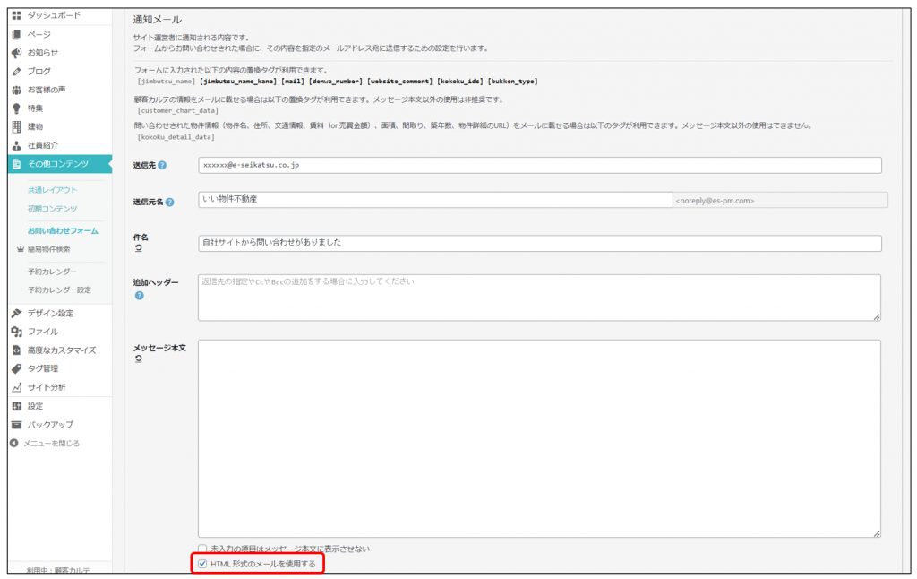 | ON | あり | ON | あり | ・物件へのお問い合わせ(※)の場合 └①基本設定>お問い合わせ設定のメールアドレスに通知 ・それ以外のお問い合わせの場合 └②その他コンテンツ>お問い合わせフォームで登録されたメールアドレスに通知 |