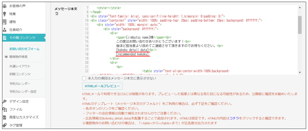 表示イメージは「HTMLプレビュー」ボタンから確認できます。