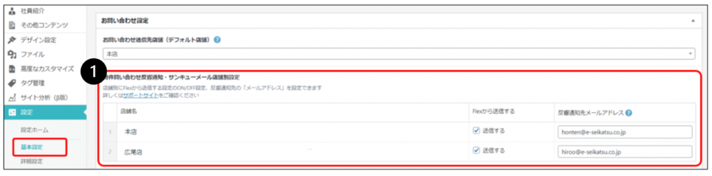 ※店舗ごとに「Flexから送信する」のチェックと反響通知先メールアドレスを入力してください。