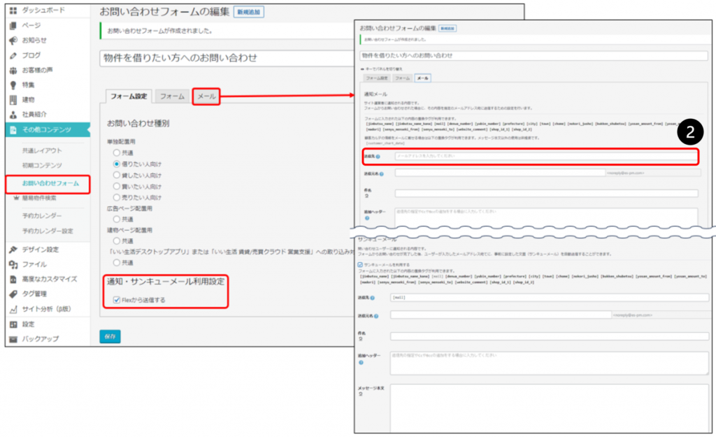 ウェブサイトFlex側で反響通知メールの送信先・サンキューメールの送信元の設定が可能です。