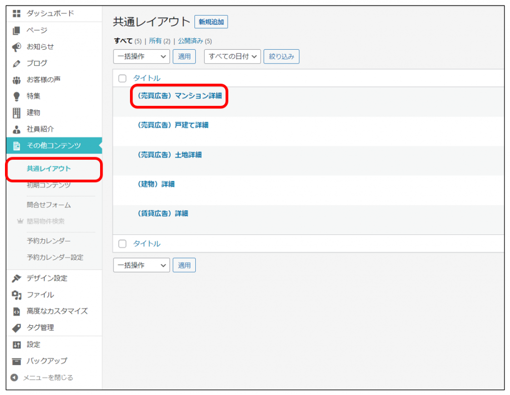 サイドメニューから「共通レイアウト」>「(売買広告)マンション詳細」を選択します。