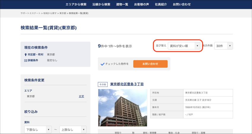 広告一覧ページでの物件の並び替え条件の初期値を設定可能です。(未選択の場合、「新着順」で表示されます)