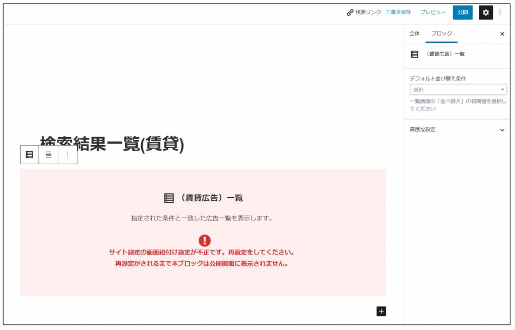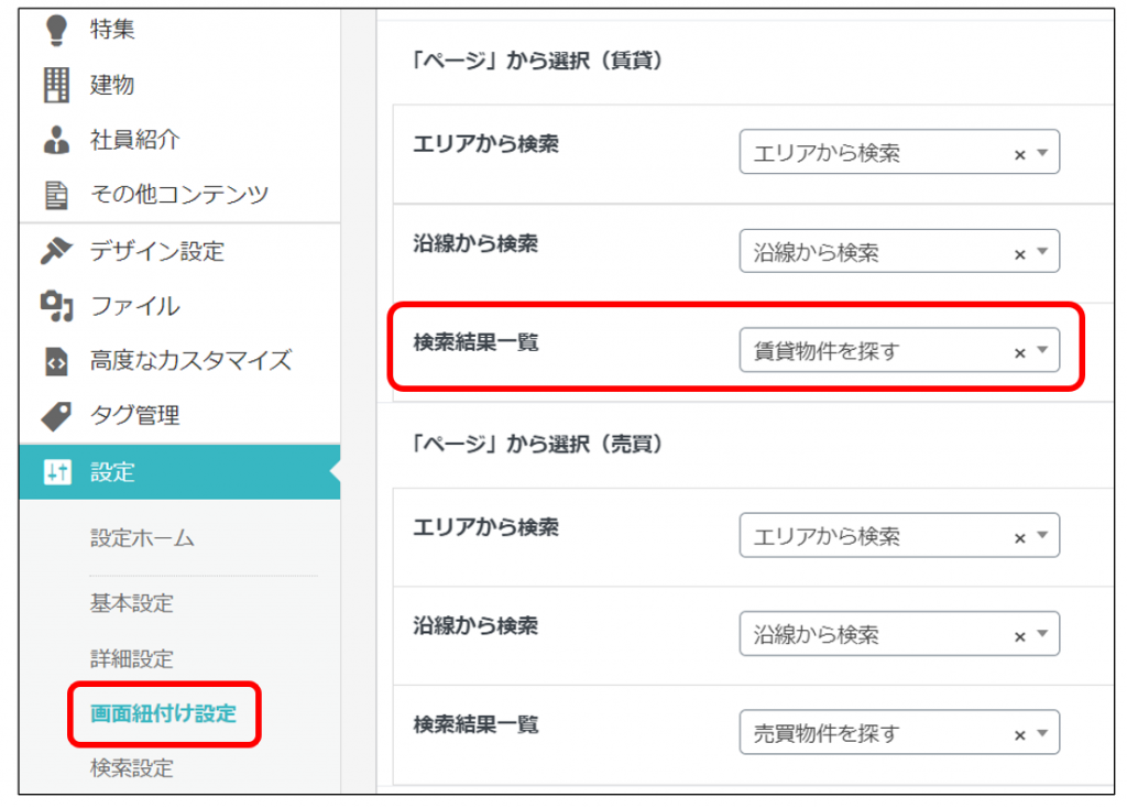 - 設定>画面紐付け設定>「ページ」から選択(賃貸)>検索結果一覧