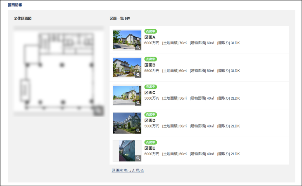 公開中・売出中の区画が6件以上ある場合は「区画をもっと見る」から、すべての区画を表示できます。