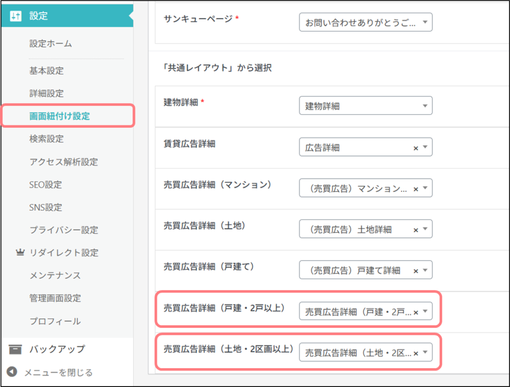 - 画面紐付け設定>売買広告詳細(戸建・2戸以上)、売買広告詳細(土地・2区画以上)