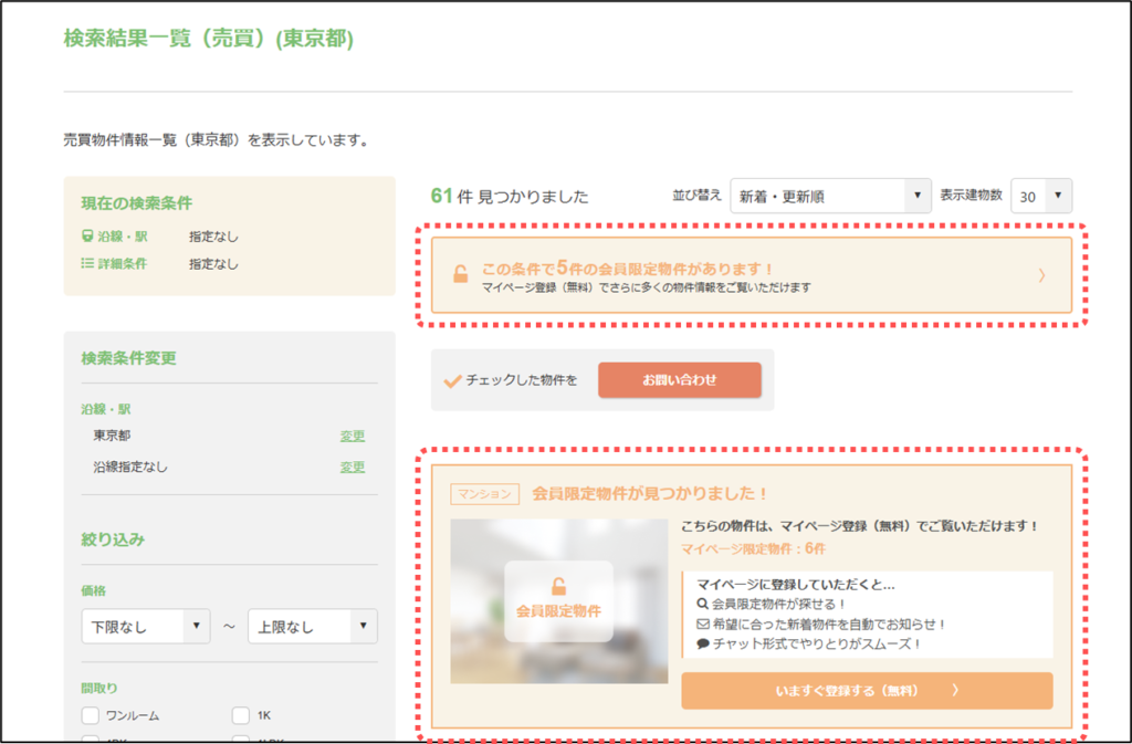 以下を全て満たしている場合に会員限定物件が表示されます。