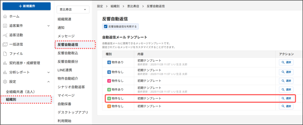 画面:設定>組織別>反響自動返信>買(物件なし)を選択