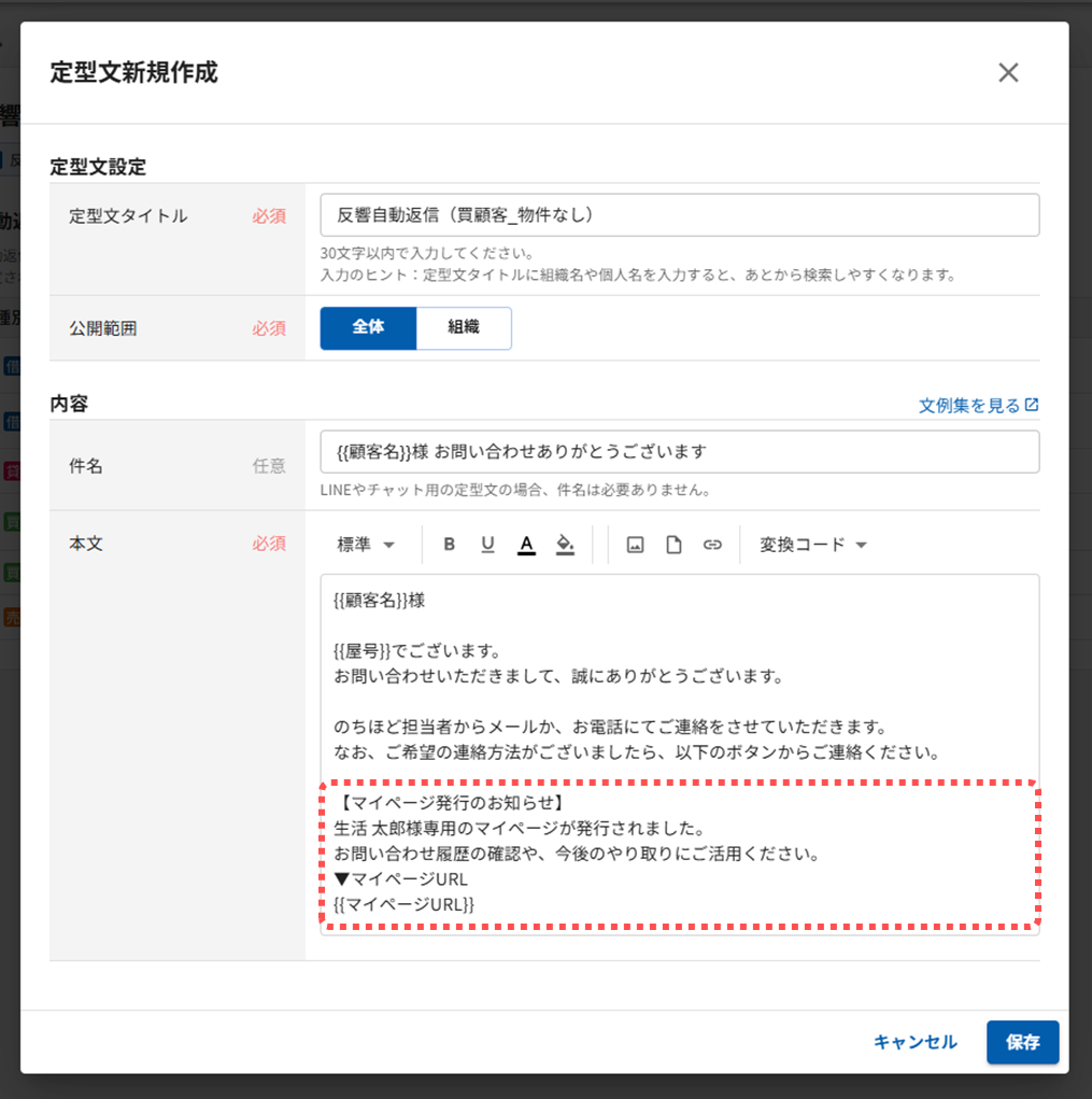 ③新規作成した定型文を反響自動返信メールのテンプレートに設定し、変更を保存してください。