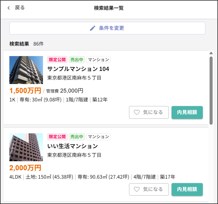 必要に応じて検索条件を変更し、物件を閲覧します。