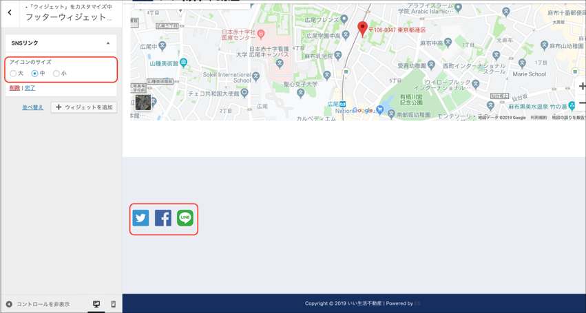 SNSリンクウィジェットを使って、フッター等にSNSリンクを表示することができます。